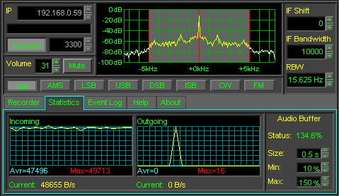 There are two graphs available under the Statistics tab; they show the amount of incoming and outgoing data traffic. There are also facilities for setting the audio buffer parameters, which define the audio latency of the connection.