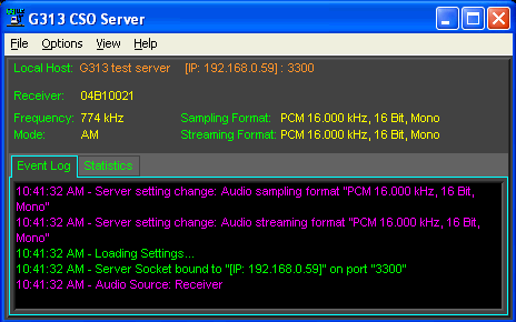 While running, the Server application displays the receiver status, streaming status and the event log:
