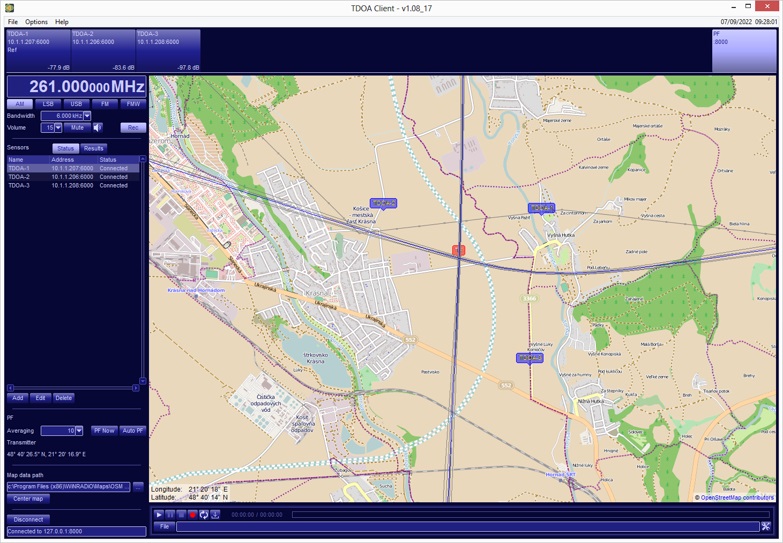 The WiNRADiO WG-8800 VHF/UHF/SHF geolocation system utilizes the proven TDOA method (time-difference of arrival) with statistical signal processing. This integrated hardware/software system accurately estimates the position of transmitters by calculating the signal propagation delay time between multiple sensors. Even when dealing with complex digitally modulated signals, this technique remains highly robust.