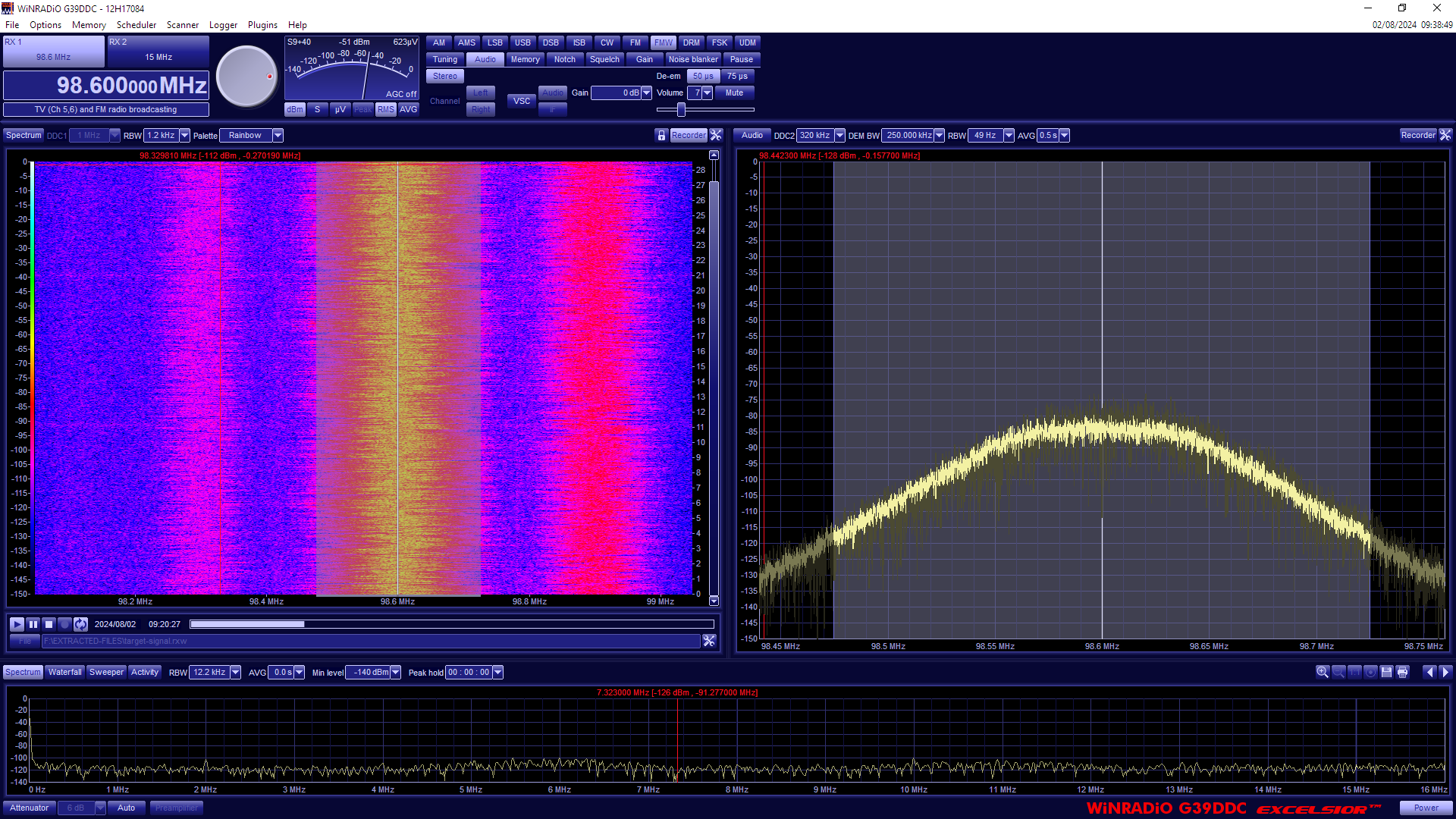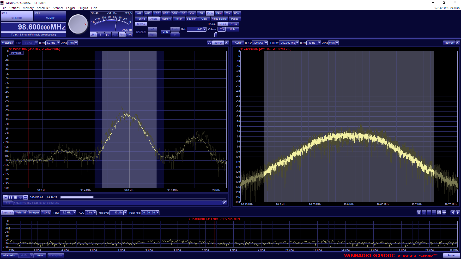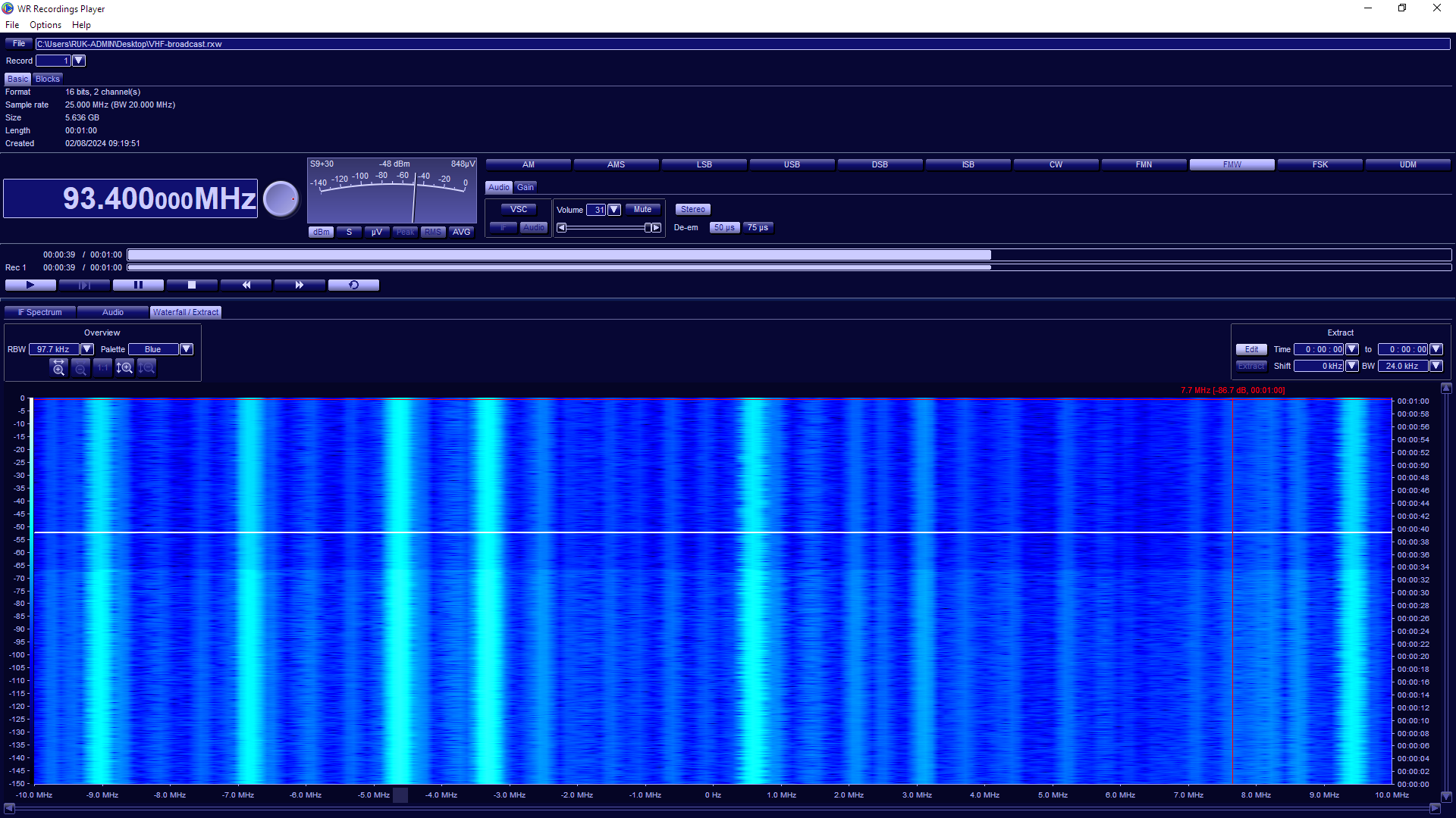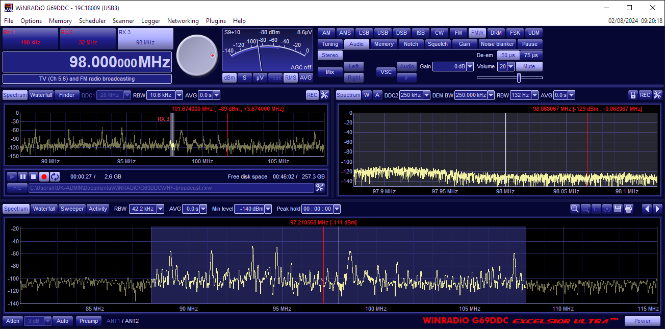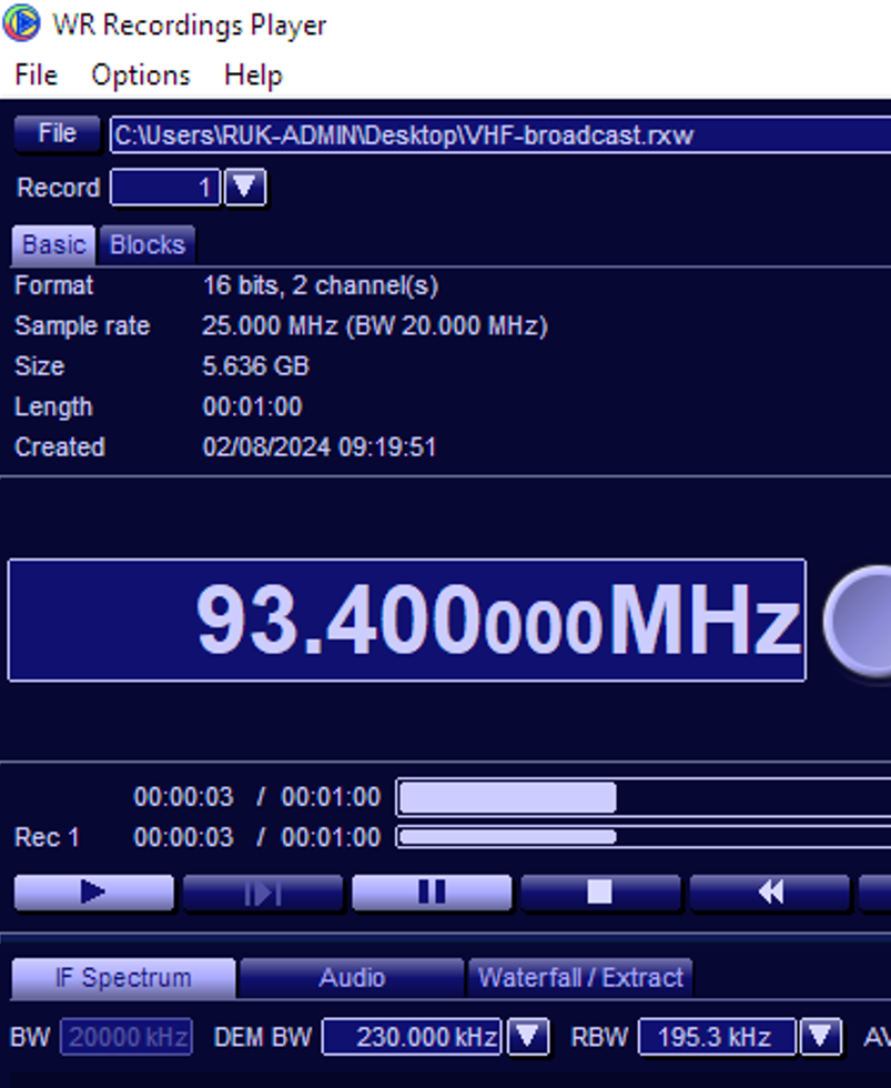 This shows the WiNRADiO G69DDC making a 20 MHz wide recording of the VHF broadcast band, one minute long.