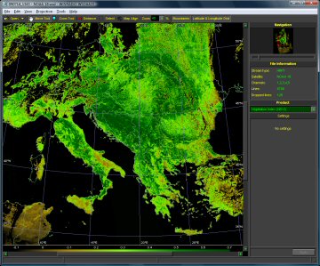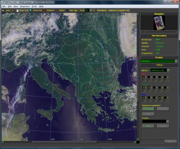 Several image handling tools are provided, most of which are located on a tool bar above the image for quick access. Viewing tools like Zoom, Pan, Image Flip and Map Align, together with informative tools such as Distance Measurement, Lat/Long Grid, Geographic Boundaries, Colour Histogram and Cursor Position Info facilitate smooth and effortless image analysis. These are complemented by various image refinement tools performing functions such as histogram equalization, noise reduction, interpolation of missing lines and image resampling.